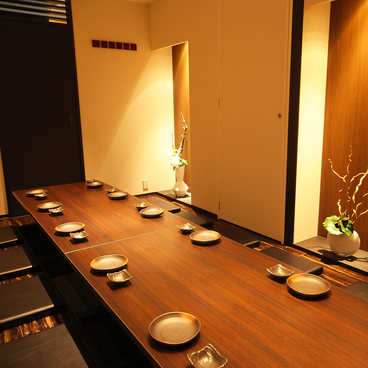 ダークな色調でまとめた店内には、掘りごたつやテーブルなど、人数に合わせて利用できるさまざまなタイプの個室をご用意。完全個室で100席ありますので、会社帰りの一杯からグループ、宴会まで、どんなシーンにも対応できます。